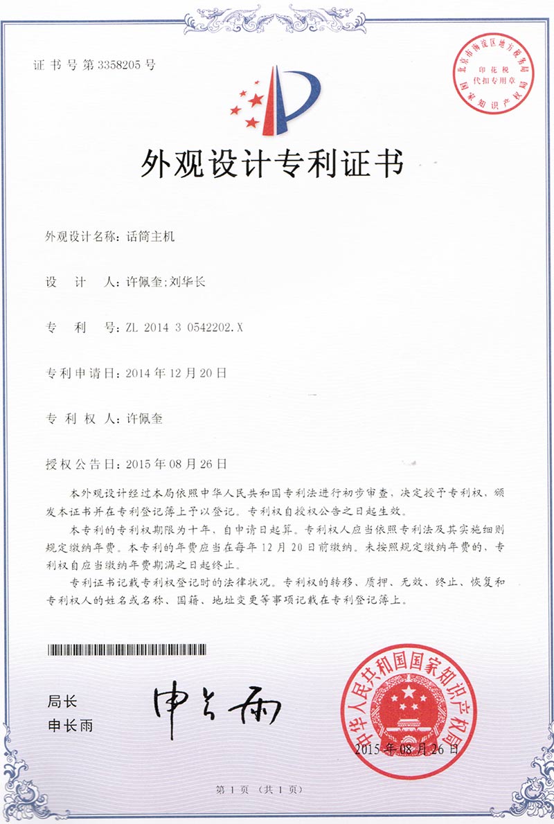 爵士龍-話簡主機 外觀設計專利證書