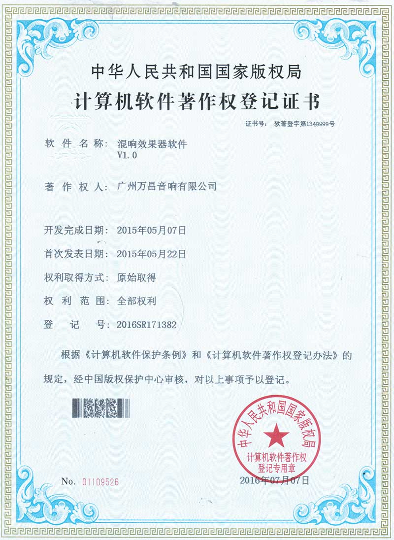 爵士龍-混響效果器軟件 V1.0計算機軟件著作權登記證書